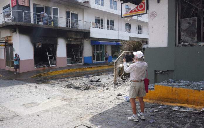 MEX5220. PUERTO VALLARTA (MÉXICO), 23/02/2026.- Personas toman fotografías a locales incendiados este lunes, en Puerto Vallarta (México). El balneario de Puerto Vallarta, en la costa del Pacífico mexicano, despertó “con mucha calma”, aunque con fuertes secuelas visibles, especialmente en turistas, tras el "secuestro" vivido durante la violencia del domingo por la muerte en un operativo militar del capo Nemesio Oseguera Cervantes, alias El Mencho, líder del Cártel Jalisco Nueva Generación (CJNG). EFE/ Arturo Montero