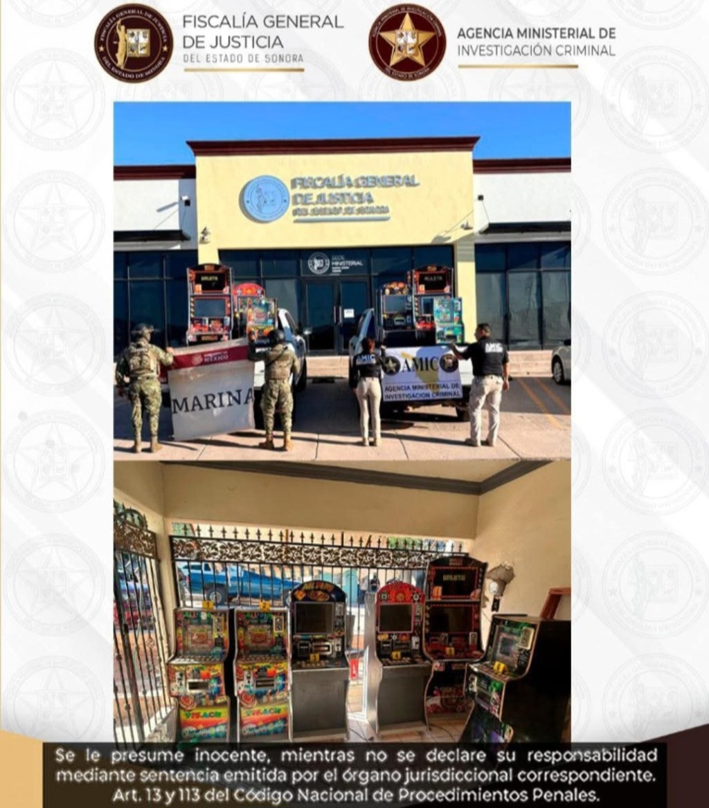 La Fiscalía General de Justicia del Estado de Sonora (FGJES) informa que, en dos operativos de cateo realizados por medio de la Agencia Ministerial de Investigación Criminal (AMIC), en coordinación con la Secretaría de Marina Armada de México (SEMAR) y la Policía de Seguridad Pública Municipal (SSPM), se logró el aseguramiento de once máquinas tragamonedas vinculadas al delito de Corrupción de Menores.