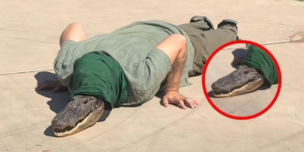 El therian permanece en el asfalto expuesto al sol, utilizando sus brazos y sus piernas en una posición similar a la de los cocodrilos cuando se desplazan, hace ligeros movimientos y sin duda alguna asombró a más de una persona.