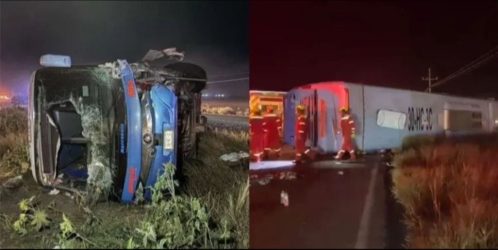 - La información establece que la camioneta habría invadido el carril contrario, impactando de frente al autobús, lo que provocó que el conductor de la unidad de transporte perdiera el control y terminara volcado sobre la cinta asfáltica.