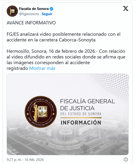 “Con relación al video difundido en redes sociales donde se afirma que las imágenes corresponden al accidente registrado el pasado 13 de febrero de 2026 en la carretera federal número 2, tramo Caborca–Sonoyta, entre un tractocamión y un transporte de pasajeros, la Fiscalía General de Justicia del Estado de Sonora informa que no cuenta, hasta el momento, con dicha videograbación en sus registros oficiales, por lo que no es posible establecer su veracidad”, publicó la dependencia en sus redes sociales.