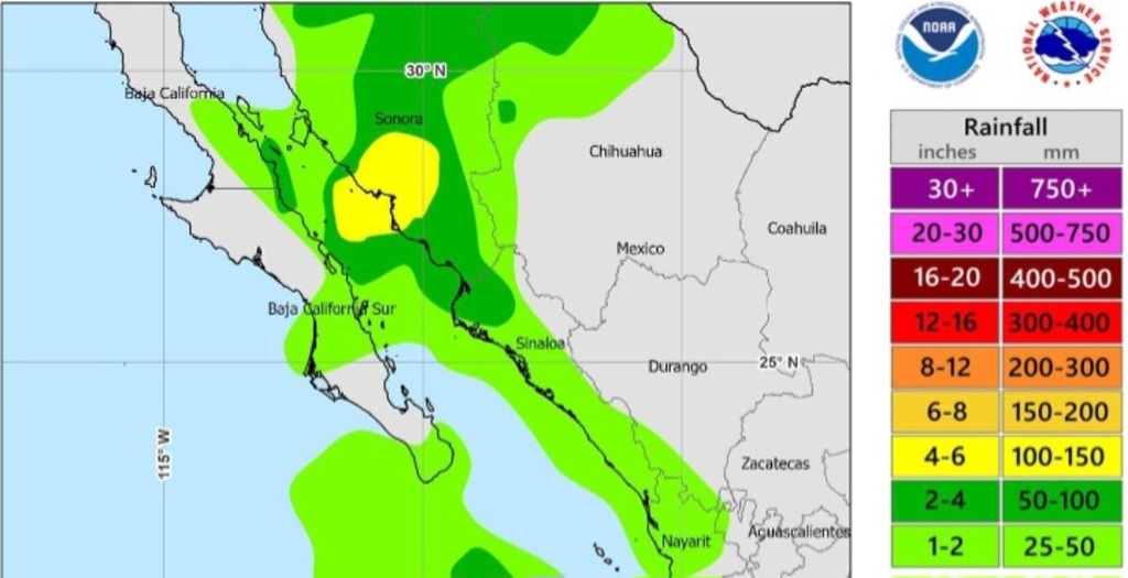 El resto nos indica prevención por lluvias de 50 a 100mm. sobre la región del Yaqui,Mayo y parte del Fuerte en el norte de Sinaloa, también todo el norte y centro de Sonora.