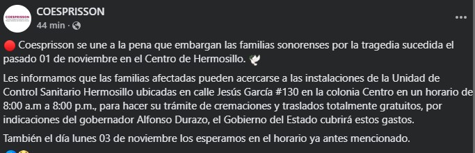 A través de las redes sociales, COESPRISSON informó este día que por instrucciones del gobernador, Alfonso Durazo, se encargarán de cubrir los gastos funerarios de las víctimas del incendio en Waldos.