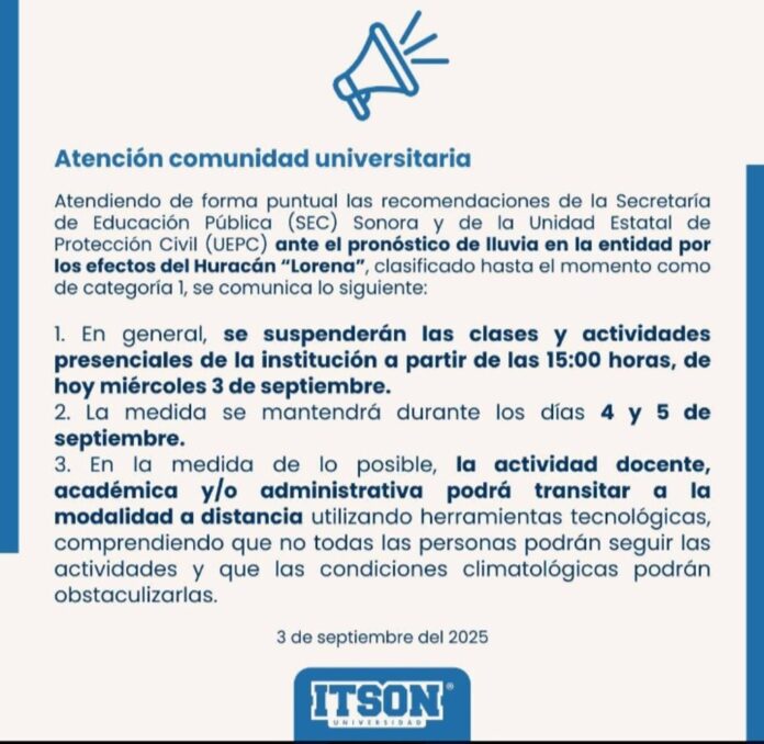 Atendiendo de forma puntual las recomendaciones de la Secretaría de Educación Pública (SEC) Sonora y de la Unidad Estatal de Protección Civil (UEPC) ante el pronóstico de lluvia en la entidad por los efectos del Huracán “Lorena”, clasificado hasta el momento como de categoría 1, se comunica lo siguiente: