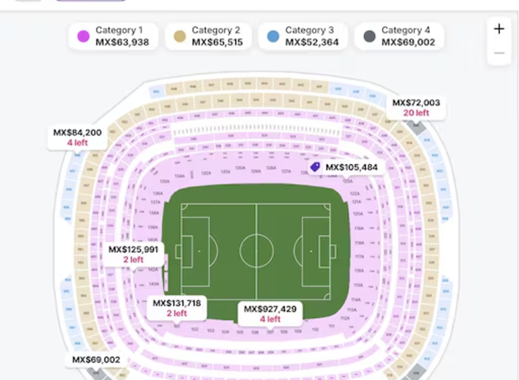 El medio Sopitas compartió una imagen del estadio y los distintos precios de acuerdo a la zona que elijas. Prácticamente a nivel de cancha, los boletos costarían 927 mil 429 pesos mexicanos, casi un millón de pesos. El más barato cuesta 63 mil 938 pesos.