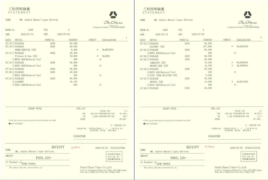 La primera factura, correspondiente al periodo del 15 al 21 de julio, sumó 500 mil 410 yenes (63 mil 57 pesos mexicanos), con cargos por habitación, servicio a la habitación, un paquete de “fitness and spa”, minibar y lavandería.