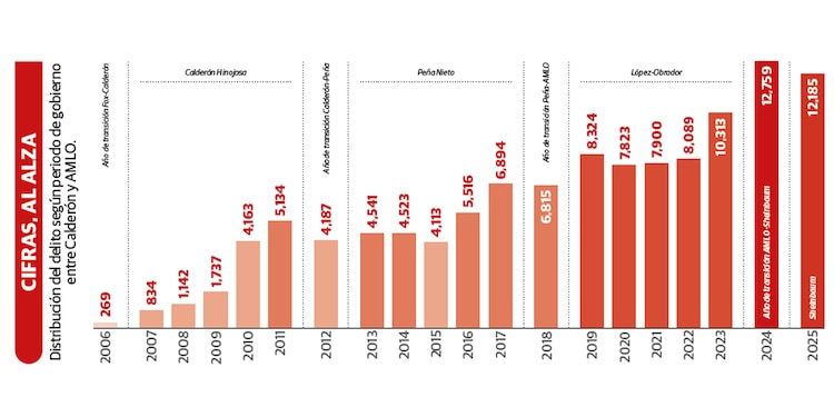 El documento distinguió tres etapas de la crisis: un ciclo de incrementos desde 2006 hasta 2011; una fase de estabilidad hasta 2015; y un periodo posterior caracterizado por aumentos constantes que rompen máximos históricos hasta 2024.Durante el sexenio de Andrés Manuel López Obrador, el fenómeno alcanzó su mayor registro.
